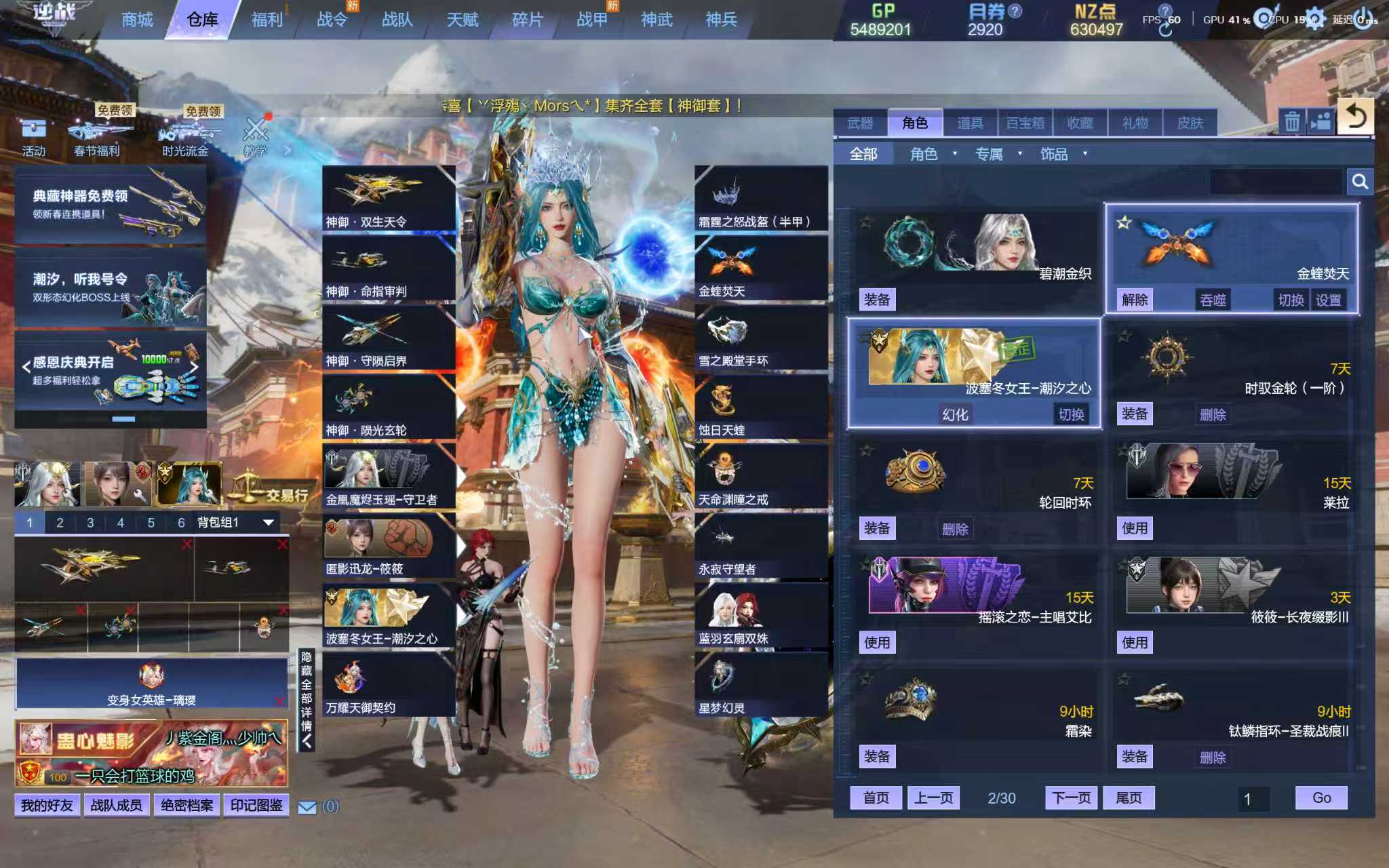 满配莱娜女王涅槃/莱娜星尘魅影/波塞冬女王/天命戒天耀套神御套/满配猎场/满配塔防四英雄臂铠/璃璎望舒龙曦